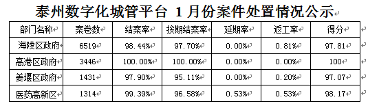 1.处置积极的突出单位。1月份高港高新区、区城管办、口岸街道、区住建局等单位案件完成情况较好。高港高新区案件处置积极主动,回复及时,实现了结案率和及时结案率双100%,综合得分100分;区住建局案件总量117起,占月度案件总数的3.36%,流转规范,处置及时,按期结案,综合得分100分;区城管办案件总量达2617件,占月度案件总数的75.14%。全部按时结案,综合得分100分;口岸街道案件总量达168件,占月度案件总数的4.82%。全部按时结案,综合得分100分。