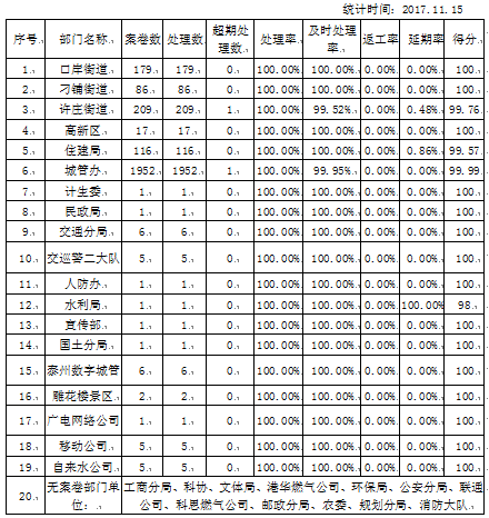 (1)10月份案件完成情况较好的单位是:高港高新区 对案件的处置积极主动,并及时回复,案件结案率,及时结案率高达100%,综合得分100分;区住建局案件总量达116起,占月度案件总数的4.51%,均能规范流转、处置及时、按期结案,综合得分99.57分;区城管办案件总量达1952件,占月度案件总数的75.86%。基本全部按时结案,综合得分99.99;口岸街道案件总量达179件,占月度案件总数的6.96%。全部按时结案,综合得分100分。