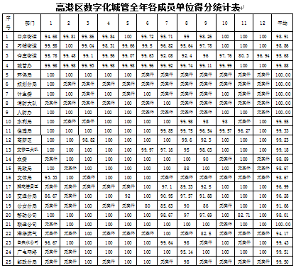 按照《高港区数字化城管长效综合管理考评办法》的相关规定,结合我区数字城管案件处置情况和平台系统案件处理统计,各成员单位得分如下: